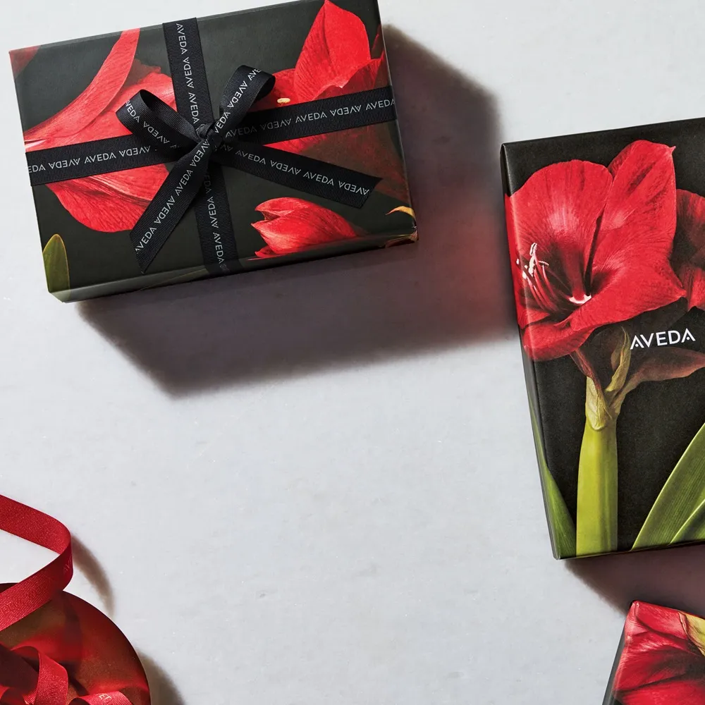 The Holiday Sets feature a red-black design adorned with the expressive amaryllis flower. It embodies confidence and beauty, immersing the sets in bold, romantic colors. The elegant design gives Aveda’s exclusive gift sets a strong, luxurious, and modern look that especially highlights the motto “Gifting with love.”