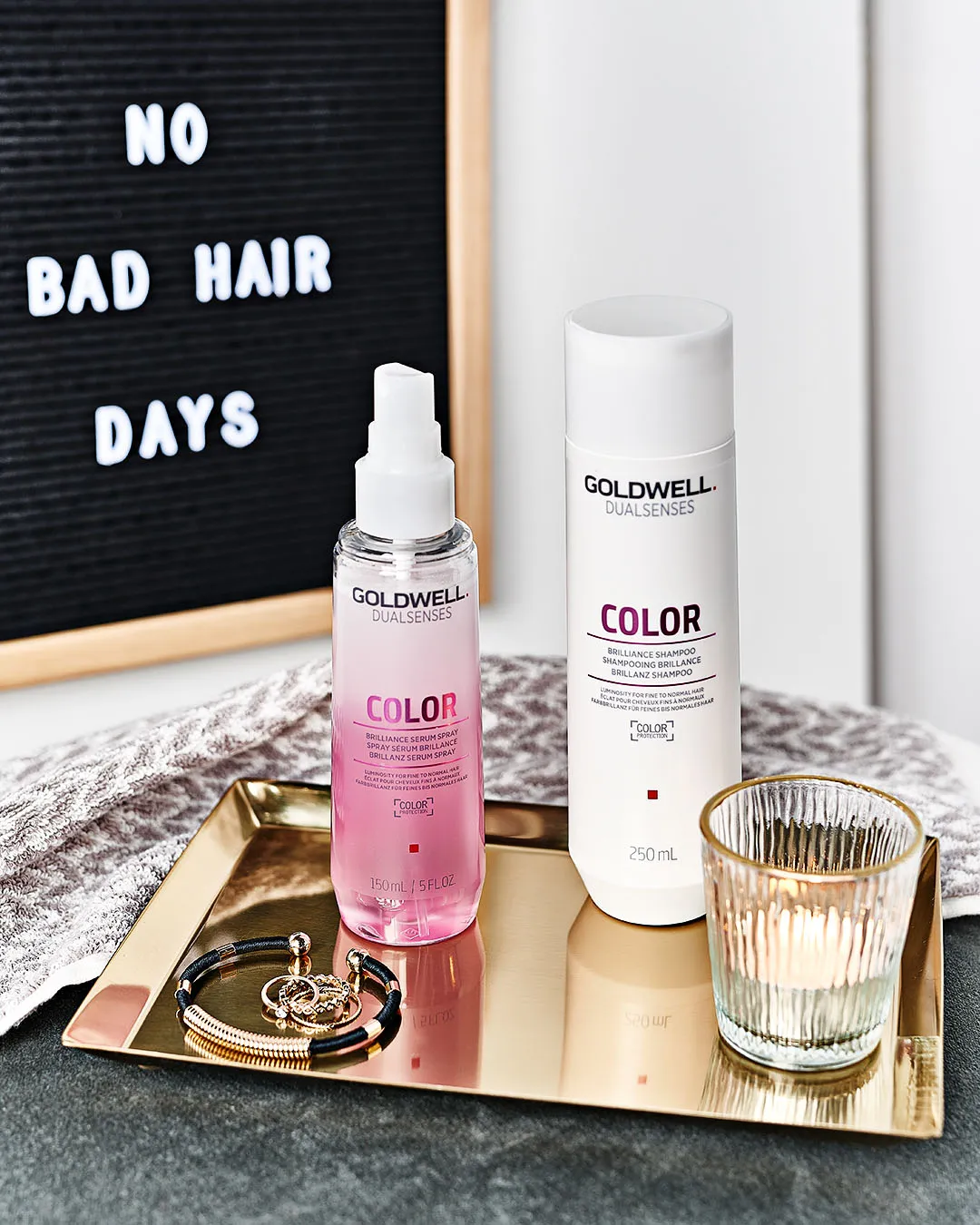 To optimally protect colored hair from fading, Goldwell Dualsenses Color shampoo, conditioner, treatment, and serum spray are available as a set at an attractive price.