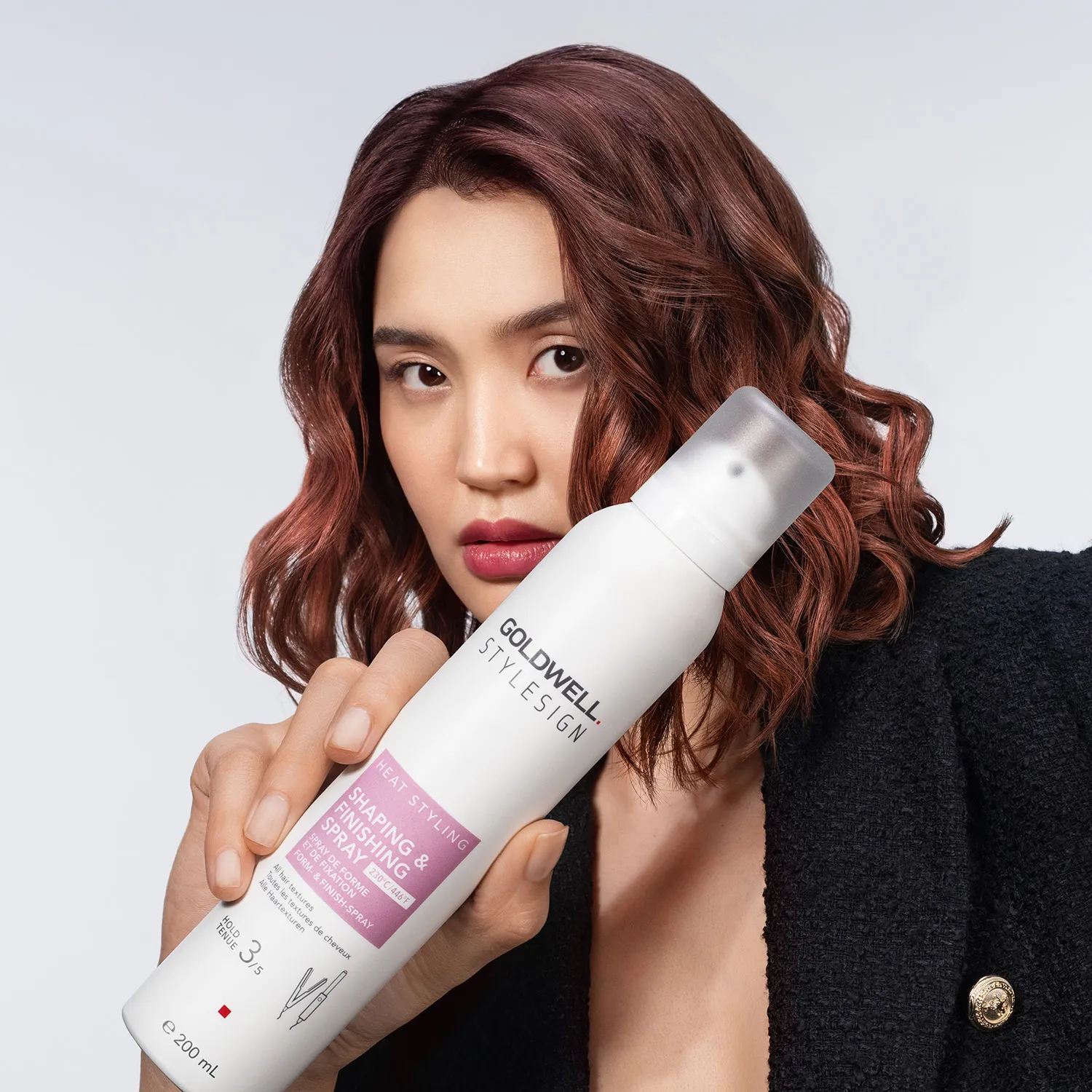 The Goldwell Stylesign Heat Styling Shaping & Finishing Spray transforms curls and waves into instantly smooth styled hair. The successor to Twist Around, it is the perfect 2-in-1 product. The spray for all hair textures even contains a heat protection up to 230 °C and protects the hair from styling heat, humidity, and frizz. Sustainable packaging of Goldwell Stylesign Heat Styling Shaping & Finishing Spray Use of 50% PCR aluminium Lightweight packaging – reduced use of raw materials Plastic reduction of the cap Application of Goldwell Stylesign Heat Styling Shaping & Finishing Spray Spray onto dry hair before using a flat iron or curling iron.