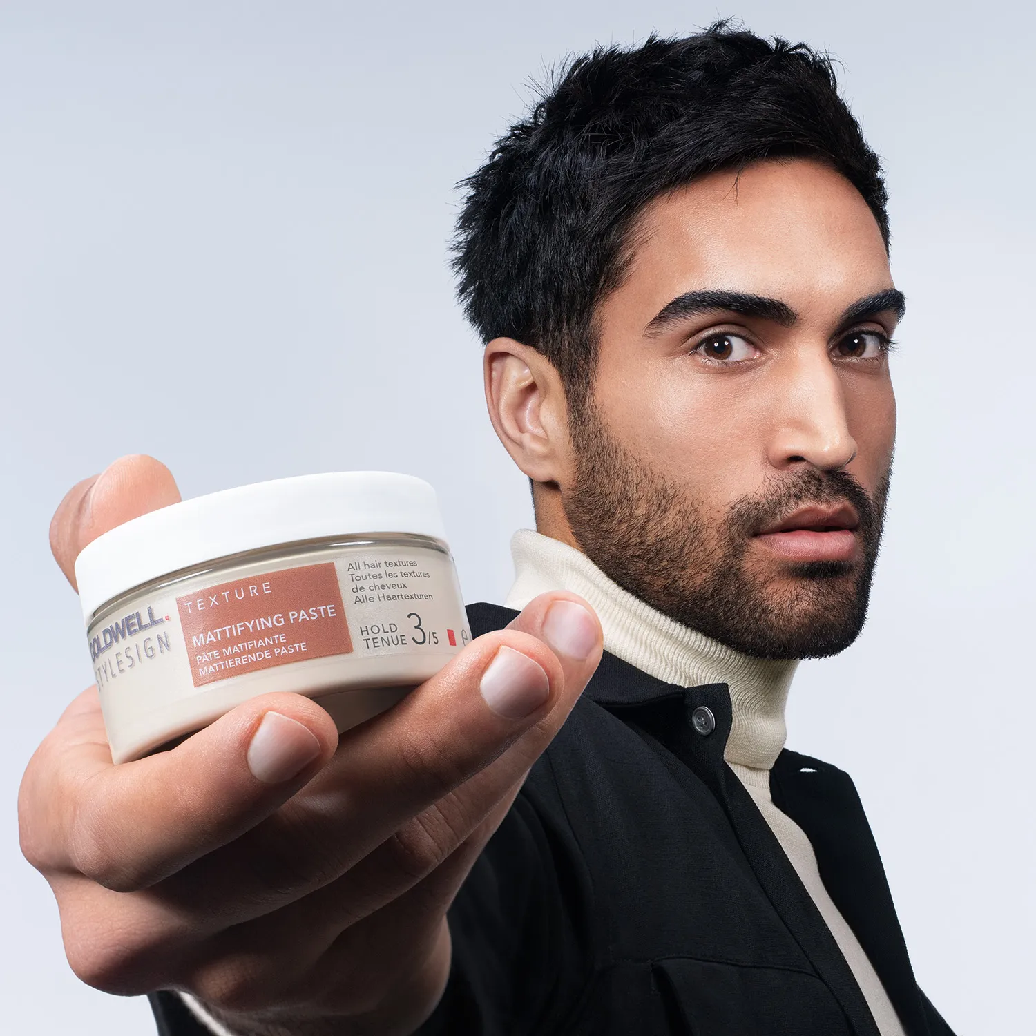 Goldwell Stylesign Texture Mattifying Paste is a styling product for fine hair with a hold factor of 3 out of 5. It provides a matte, rough, and super dry finish. Known as “baby hairs” and flyaways are tamed without making the roots appear greasy. The result is a textured and structured finish with volume. 99% of the packaging is made from PCR materials. The washable labels and a colourless PET packaging improve recyclability. Application of Goldwell Stylesign Texture Mattifying Paste The paste is worked into dry or towel-dried hair.