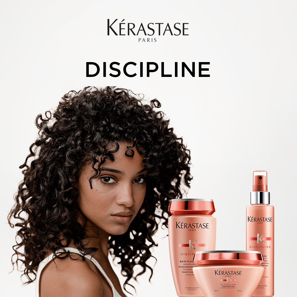 Kérastase Discipline is the luxury care line for unruly and curly hair. With the highest pro-keratin concentration of all Kérastase product families, the Discipline products smooth the hair fiber for healthy, soft, and disciplined hair.