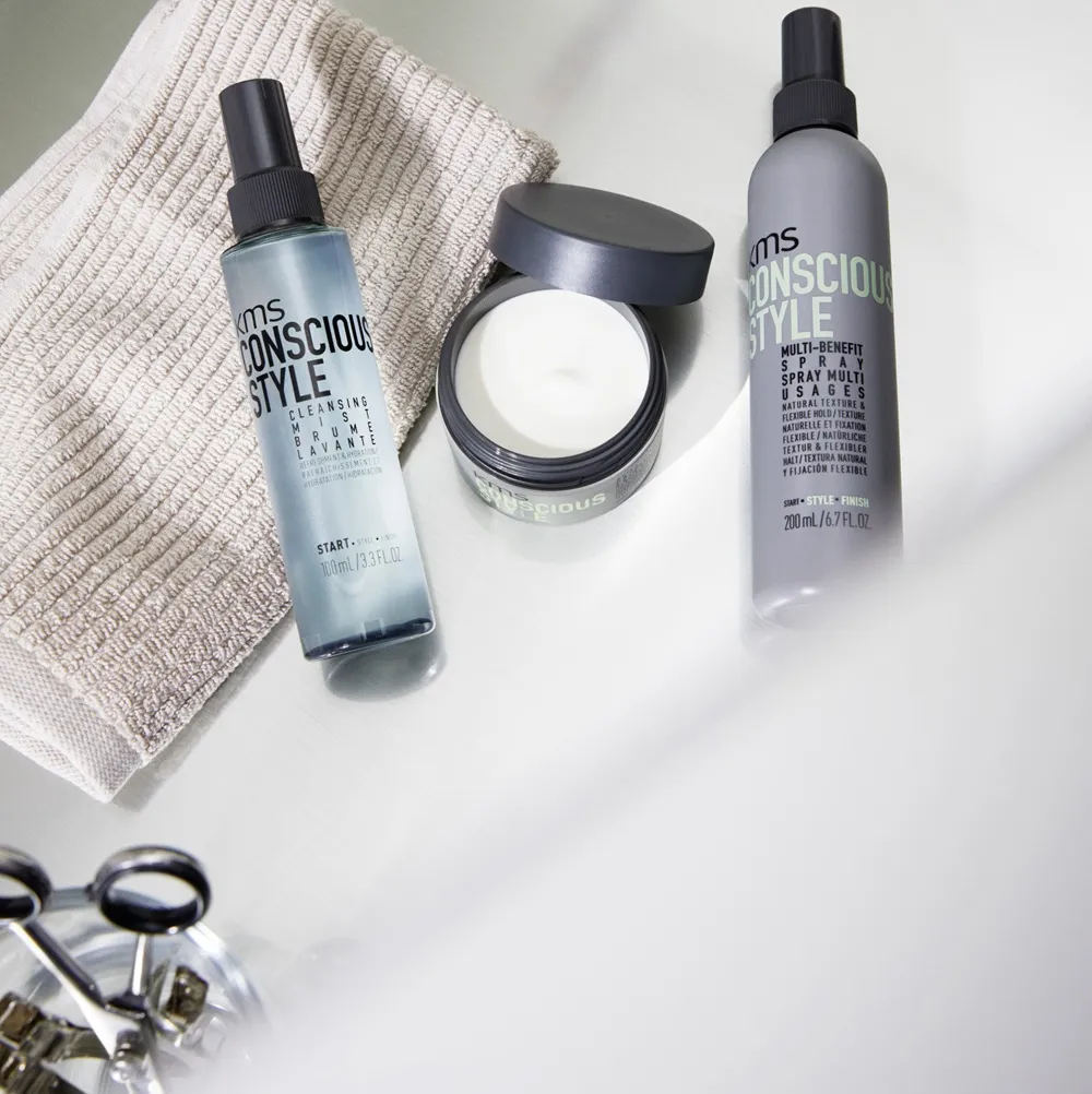 A conscious lifestyle requires conscious decisions. With the new KMS Conscious Style product line, this becomes entirely possible. It includes Every Day Shampoo, Every Day Conditioner, Styling Putty, and Multi-Benefit Spray. By using these products, you create minimal impact on the planet while achieving maximum performance from start to finish.