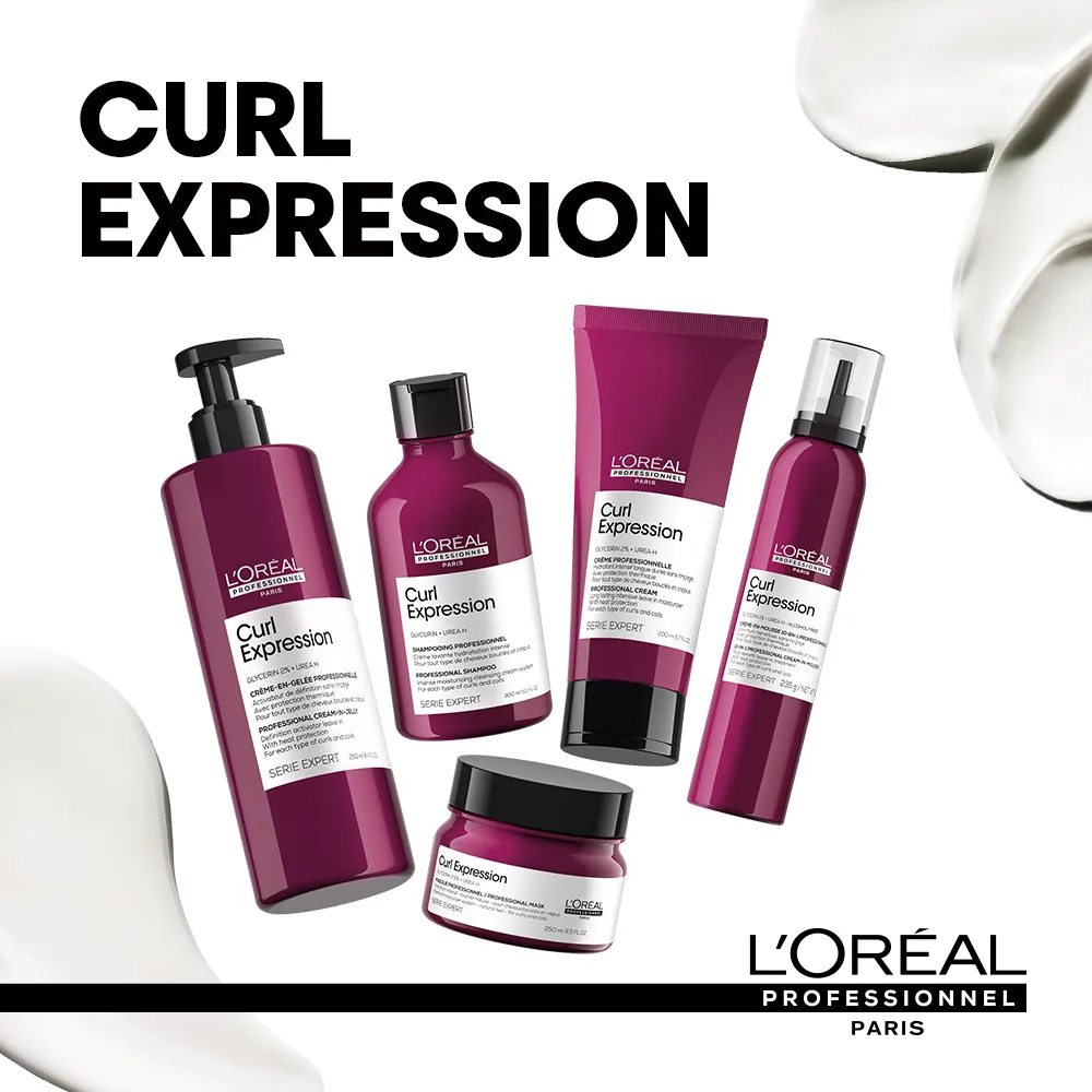 he Curl Expression Long Lasting Intensive Moisturizer by L'Oréal Professionnel Paris has been created for wavy, curly and coily hair. This professional styling product moisturises severely dehydrated hair and leaves it feeling silky smooth and supple. Infused with glycerin, urea H and hibiscus seed extract, the formula delivers much-needed hydration and adds definition to coily, unruly hair. Curls and coils are effectively replenished and feel softer and stronger. This leave-in cream for curls additionally provides heat protection up to 230°C* and prevents damage caused by blow-drying or heat styling. How to use L'Oréal Serie Expert Curl Expression Long Lasting Intensive Moisturizer Apply a small amount to finger tips and distribute evenly throughout lengths. The drier the hair, the more product you can use. Pro Tips: On curls: Apply to towel-dried hair before the Cream-In-Mousse. On coils: Apply to towel-dried hair after the Definition Activator and follow with the Cream-In-Mousse. *Instrumental test