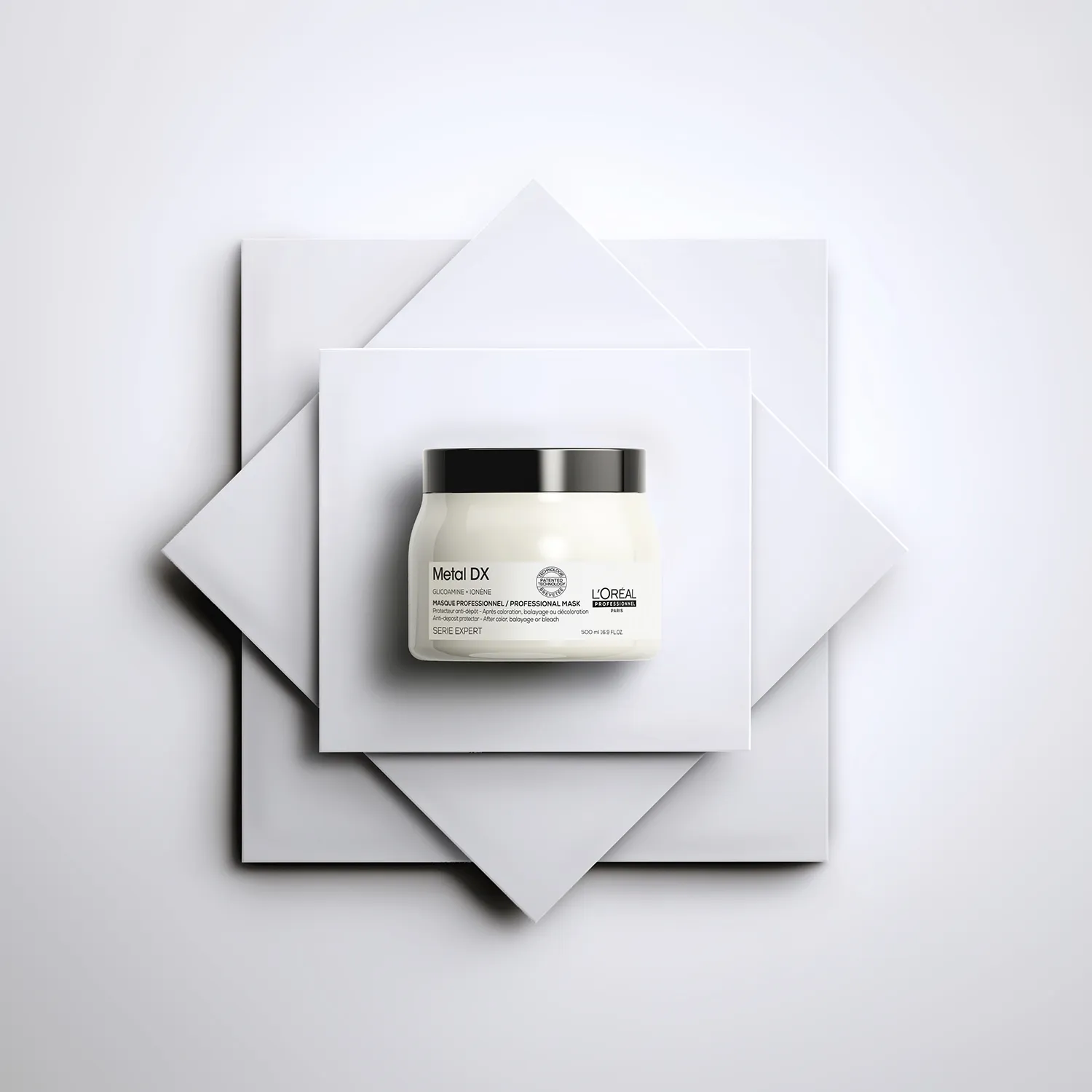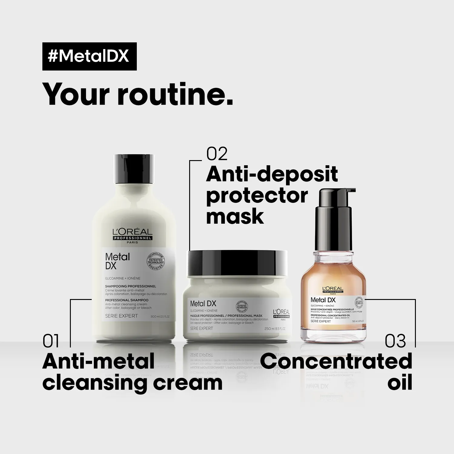 Innovative technology for neutralizing harmful metals. The Metal DX range from L'Oréal Professionnel was developed to protect the hair from metal deposits that can accumulate during washing with tap water and negatively affect the hair color. With its innovative technology, the line neutralizes these particles, reduces hair breakage, and ensures that colored hair retains its radiance longer – for vibrant colors, smooth hair, and professional care results.
