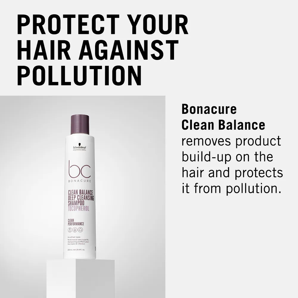 Schwarzkopf BC Bonacure Clean Balance is formulated for all hair types. The products provide deeply cleansed hair with the active ingredient Tocopherol and a fresh hair feeling for up to 24 hours. Clean Balance from Schwarzkopf Professional is an easy yet effective method to efficiently remove environmental pollutants from the hair and support hair health.