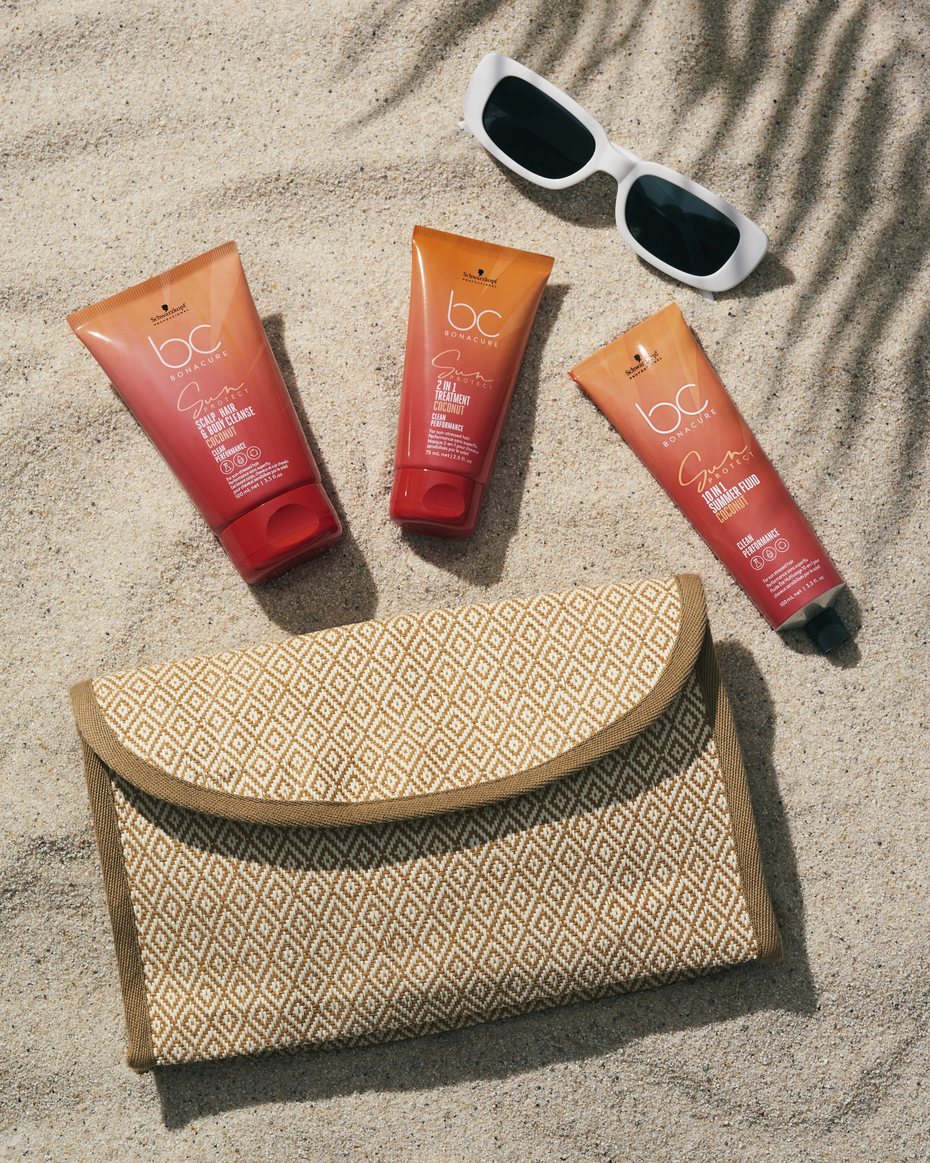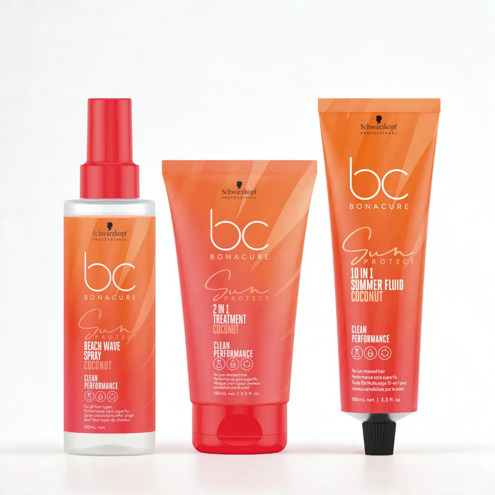 - While sunbathing, apply the Schwarzkopf BC 10-in-1 Fluid several times throughout the day to keep lengths and ends protected. Finish your routine with the BC Sun Protect Beach Waves Spray for beautiful summer waves.