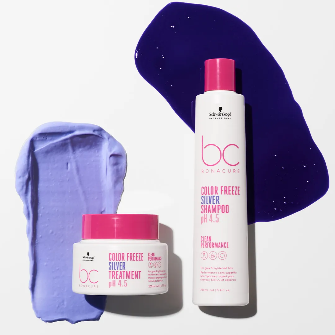 Schwarzkopf BC Bonacure Color Freeze Silver Treatment is a pigmented, intensive reconstructive treatment specially formulated for grey and bleached hair. It provides deep conditioning and neutralises unwanted warm undertones, while being free from silicones and artificial dyes. The care formula with vegan keratin and Cell Equalizer technology promotes hair rebuilding on one hand and ensures the cuticle layer is sealed on the other. Additionally, the Schwarzkopf silver mask – like all products from Color Freeze – restores the hair to the optimal pH level to lock colour pigments deep within the hair structure, preventing colour fading. Schwarzkopf BC Bonacure Color Freeze Silver Treatment Benefits Deep conditioning and up to 95% less hair breakage Restores hair to its optimal pH of 4.5 and achieves up to 90% colour durability for up to 30 washes Neutralises unwanted warm tones and revitalises & supports cool shades Adds a Cendré shimmer to white hair and very light base tones Application of BC Bonacure Color Freeze Silver Treatment Apply to washed, towel-dried hair and leave in for up to 10 minutes. Rinse thoroughly.