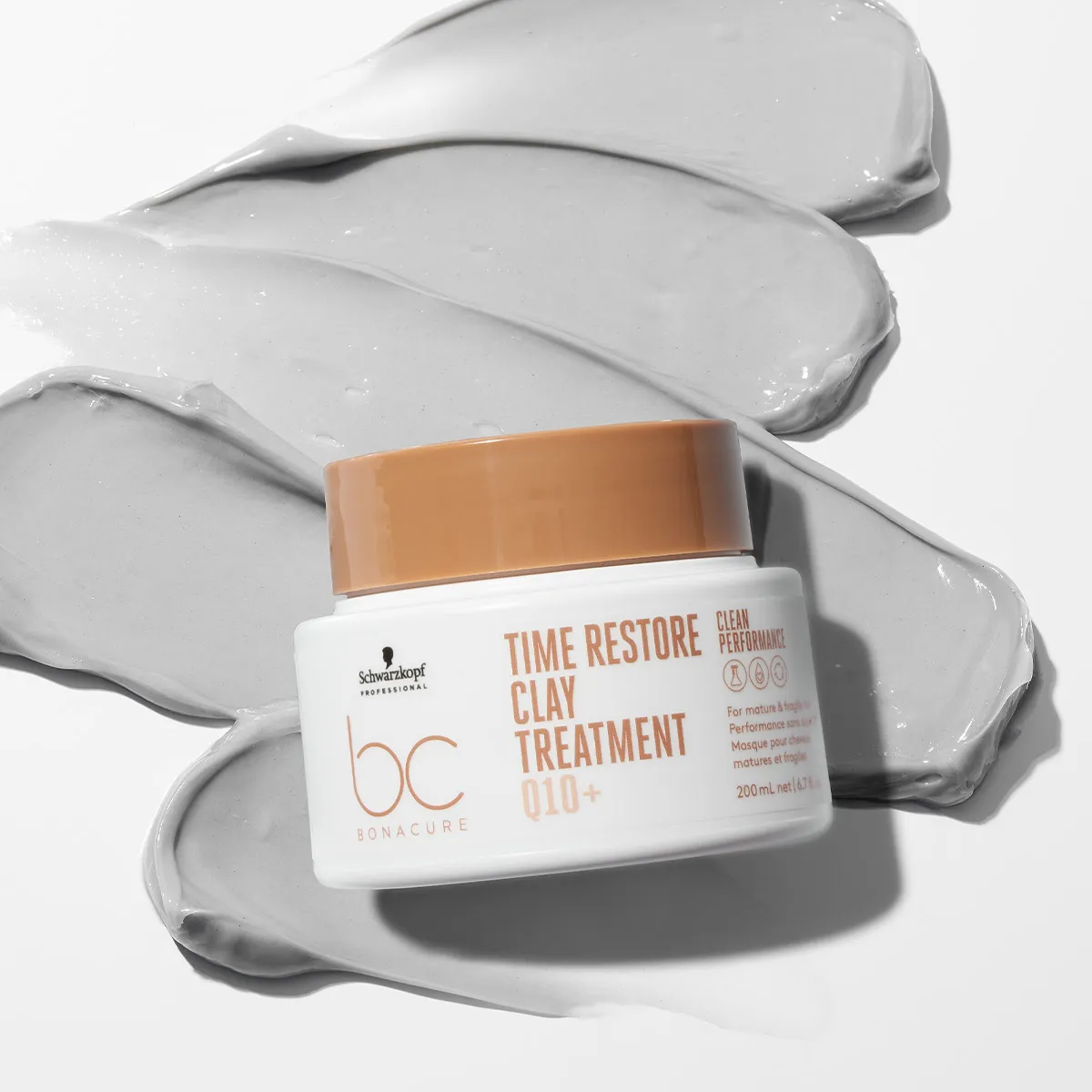 The Schwarzkopf BC Bonacure Time Restore Clay Treatment features advanced technology with a vegan care complex containing a keratin alternative and Q10+ with anti-ageing effects. Therefore, the Clay Treatment with clay is ideal for caring for mature and long hair. The brilliant formula centered around the Time Restore Complex eliminates visible signs of ageing such as unruly or dull hair and simultaneously stimulates the natural keratin synthesis of the hair.EffectThe strengthening treatment with clay texture provides increased elasticity, resilience, and vitality. It offers a hair feeling moisturised for up to 48 hours.The Q10+-enriched treatment reduces visible signs of ageing (dull, brittle, and sensitive hair) and immediately imparts smoothness and shine.The vegan keratin mask reactivates the hair and helps to cleanse the pores of the scalp. Additionally, it protects hair and scalp with an antioxidant effect from external aggressors. The result: Younger-looking, more vital hair with improved elasticity and a wonderful hair feel.ApplicationLeave on for up to 10 minutes on towel-dried, washed hair. Rinse thoroughly.