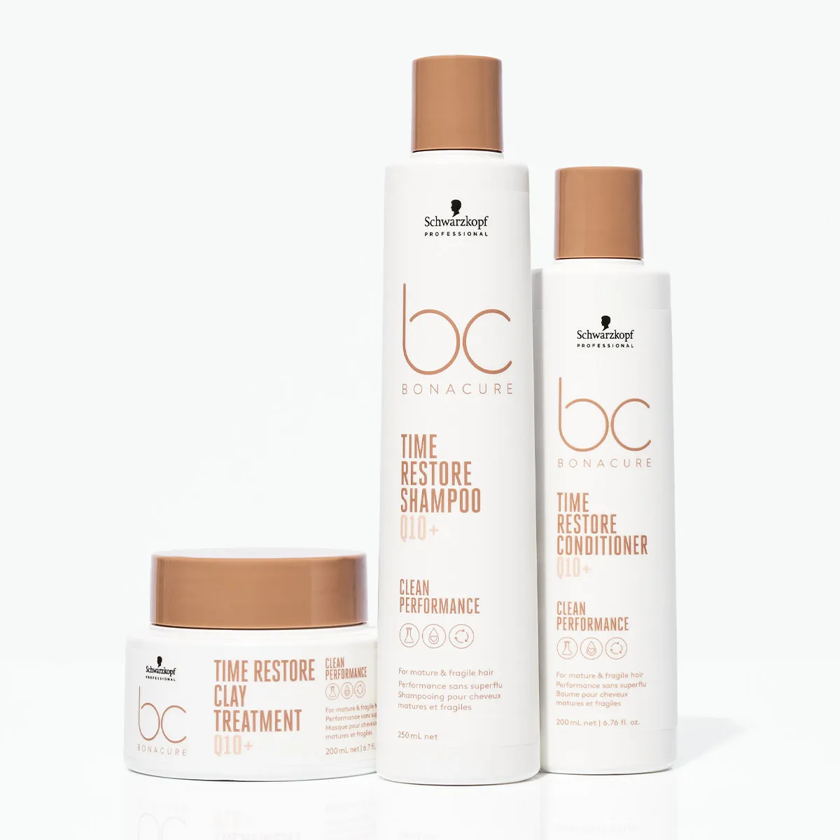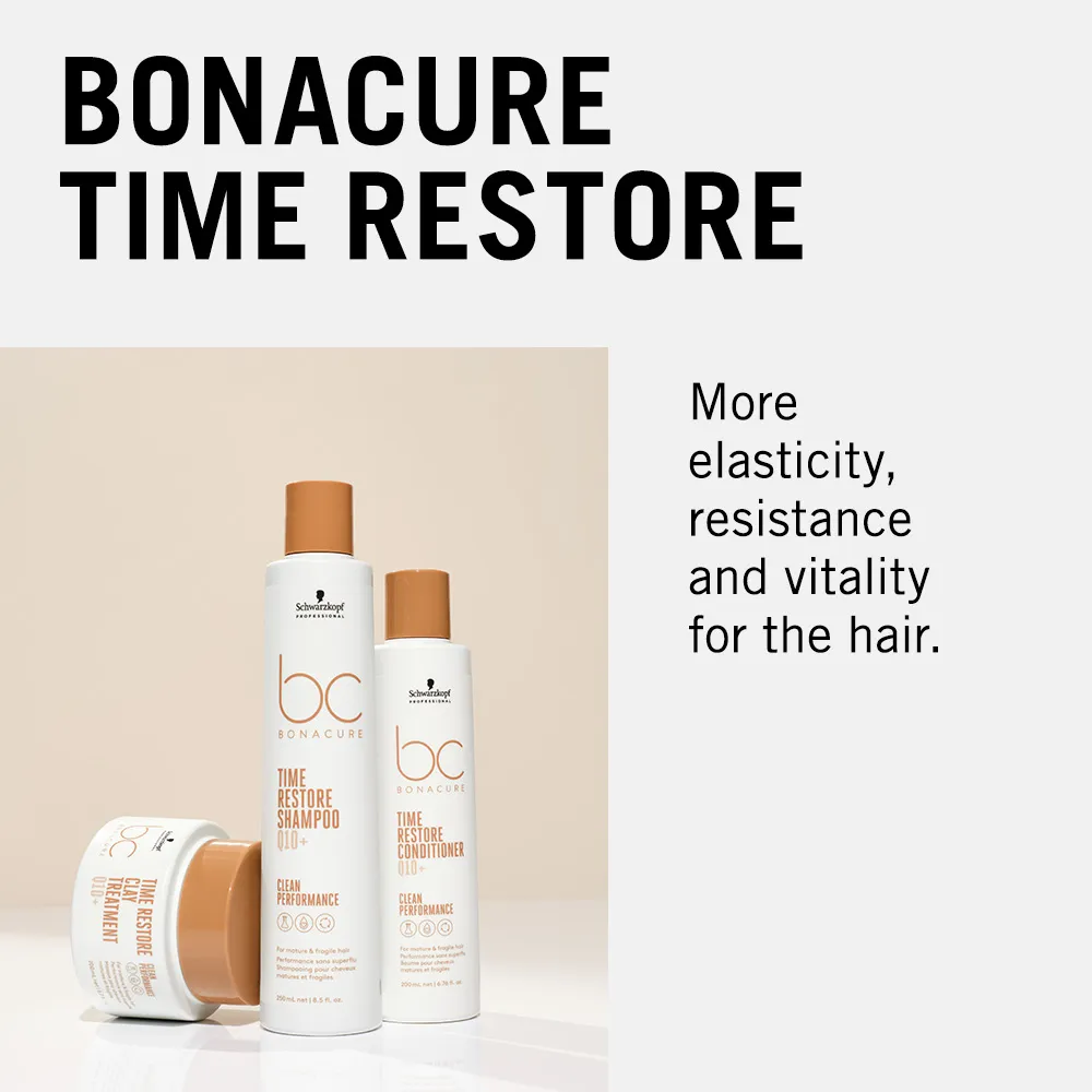 Reifen and sensitive hair? The Schwarzkopf BC Time Restore Set provides optimal care for aging hair. Based on anti-age skincare, Time Restore has been specifically developed as anti-age hair care. The main active ingredient is Q10+, a highly effective coenzyme that revitalizes cells. Contents of the Schwarzkopf BC Time Restore Set Schwarzkopf BC Time Restore Shampoo 250 ml Schwarzkopf BC Time Restore Conditioner 200 ml Schwarzkopf BC Time Restore Clay Treatment 200 ml Effects of the Schwarzkopf BC Time Restore Set on mature hair increased elasticity, resilience, and vitality reduces visible signs of aging smooth and shiny hair improved combability