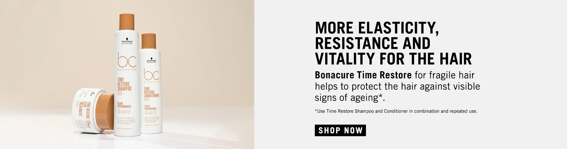 The brilliant Bonacure Time Restore Complex in the Bonacure Time Restore products instantly eliminates visible signs of aging while simultaneously stimulating the hair’s natural keratin synthesis.
