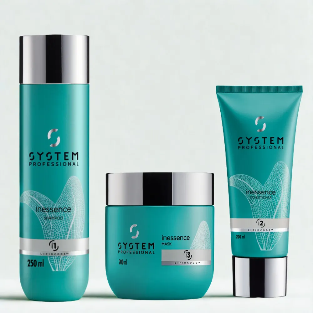System Professional Lipid Code Inessence draws inspiration from nature and combines it with hair care science. The result is a line with ingredients that are 91% natural and free from sulfates, parabens, and silicones. The remaining 9% consist of stabilisers and fragrances. Inessence revitalises strong, dry, and unruly hair from the root.