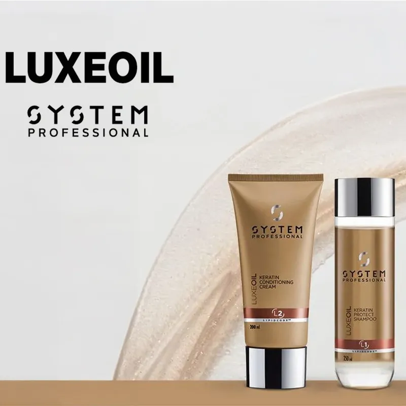 The System Professional Lipid Code LuxeOil Keratin Conditioning Cream provides all hair types with immediate smoothness and keratin protection at any time. System Professional Lipid Code LuxeOil Keratin Conditioning Cream: Luxury Conditioner with Precious Oils The conditioner is enriched with oils valuable to the hair. Argan, Jojoba, and Almond oils envelop the hair with an intensely nourishing and keratin-protecting formula. The treatment unfolds its full effect in just 30 seconds and immediately provides Luxuriously smooth hair Protection against styling damage Increased moisture Nourishment for the hair Protection of the hair fibre Improved combability Application of System Professional Lipid Code LuxeOil Keratin Conditioning Cream The cream is gently massaged into towel-dried hair and carefully combed through with a wide-tooth comb. After 30 seconds of processing, emulsify the cream and rinse thoroughly.